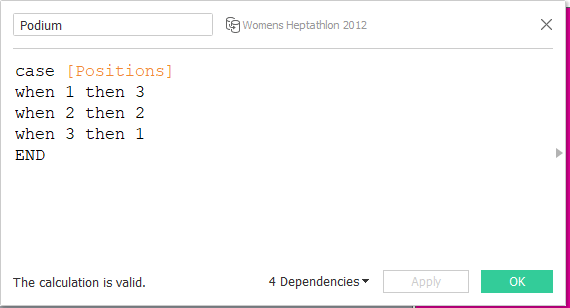 Finally, I wanted to show the podium results. I’d toyed with adding in an image and then it dawned on me…the podium is basically a bar chart! So I added in a bar chart to show the three medal winners. I will admit I had to get a bit creative on the bar chart to invert the rank. First position (rank=1) needs to be the biggest bar, so I cheated by adding in a case statement to reverse the rank.