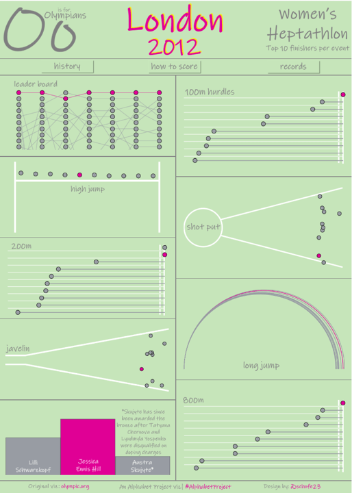 I wanted the shot put and javelin charts to look like the field with circles to pinpoint where each shot or javelin landed. I didn’t have the angles of each throw, so I settled on using random() on rows to spread the dots around the field and put result on to columns to show the distance. I then added the simple field diagrams to give the idea of seeing the results from an aerial view and again highlighted Jess’ results.